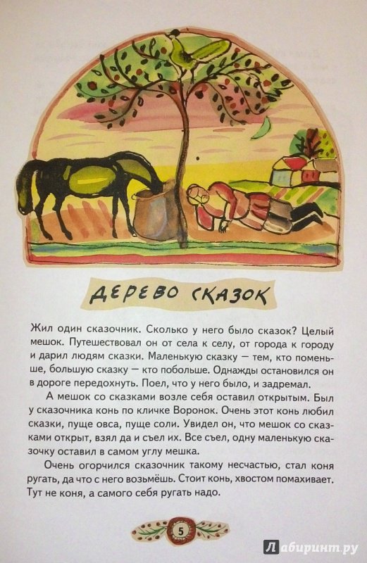 "Дерево сказок" - это сборник 35 коротеньких философских зарисовок Бориса Сергуненкова. Все начинается с заглавной истории про сказочника и его лошадь. Сказочник заснул, лошадь залезла в открытый мешок и съела все его сказки, одну только оставила, самую маленькую, ее-то и посадил наш сказочник в землю, и на этом мест...