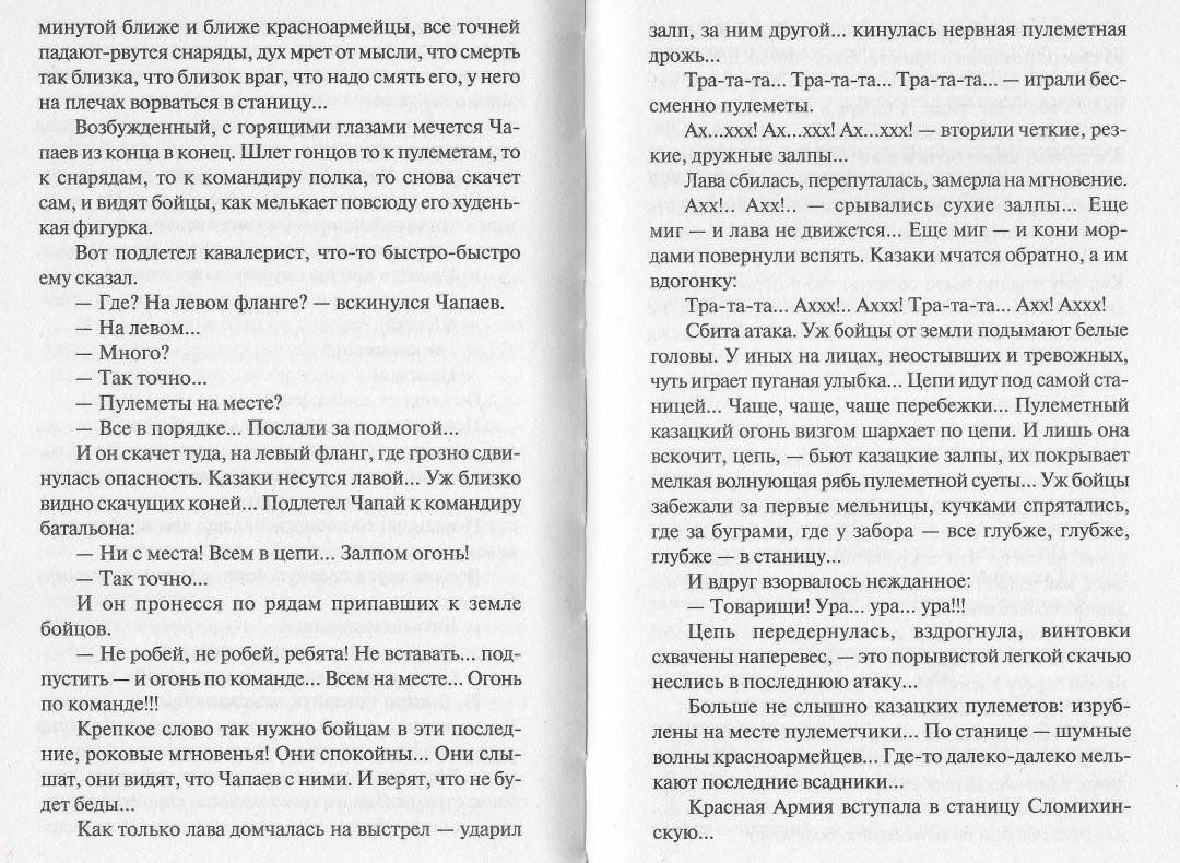 Роман "Чапаев" посвящён легендарному герою гражданской войны - Василию Ивановичу Чапаеву. В книге рассказывается о последнем годе жизни прославленного комдива, описываются бои за Сломихинскую, Пилюгино, Уфу, а также гибель Чапаева в битве у Лбищенска.