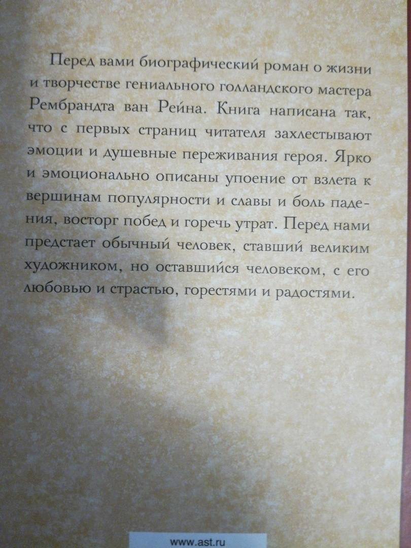 Перед вами биографический роман о жизни и творчестве гениального голландского мастера, Рембрандта ван Рейна. Книга написана так, что с первых станиц читателя захлестывают эмоции и душевные переживания героя. Ярко и эмоционально описаны упоение от взлета к вершинам популярности и славы и боль падения, восторг побед и горечь утрат. Перед нами предстает обычный человек, ставший великим художником, но оставшийся человеком с его любовью и страстью, горестями и радостями.