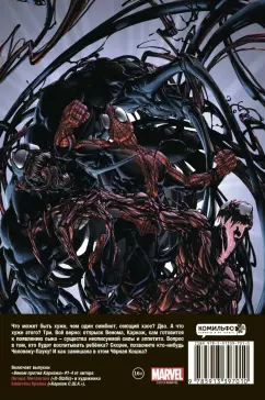 Купил и был крайне разочарован . Не истории , не нормального развития сюжета . Рисовка для кого как , но мне не зашла . Читать скучно . Битвы венома и карнажа как таковой нет . Только нытье что с обоих сторон ,так еще и человек паук с черной кошкой не к силу не к городу . Комикс надо было назвать рождение таксина...