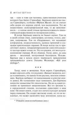 Опубликованная впервые, автобиография Ингмара Бергмана, одного из самых известных и самобытных режиссеров 20 века, вызвала широкий резонанс: никто не ожидал от 69-летнего мэтра такой откровенности. В ней есть все о юности режиссера, о технических трудностях и творческих муках, с которыми ему пришлось столкнуться во время создания своих ранних работ. Воспоминания о жизни, бурлящей за кулисами, прерываются размышлениями художника о сущности кино, о театре, об отношениях с женщинами, о смысле жизни и невозможности счастья.
