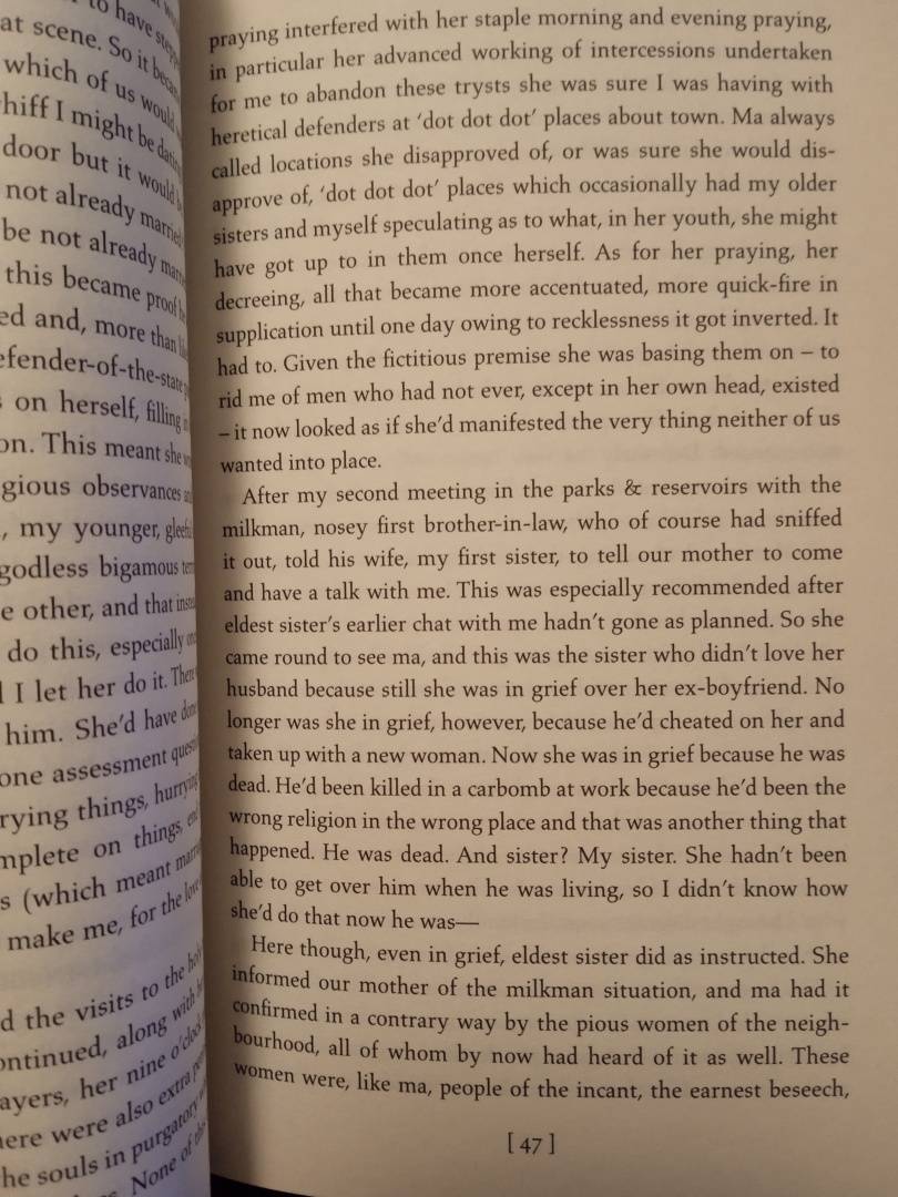 In this unnamed city, to be interesting is dangerous. Middle sister, our protagonist, is busy attempting to keep her mother from discovering her maybe-boyfriend and to keep everyone in the dark about her encounter with Milkman. But when first brother-in-law sniffs out her struggle, and rumours start to swell, middle sister becomes `interesting`. The last thing she ever wanted to be. To be interesting is to be noticed and to be noticed is dangerous.