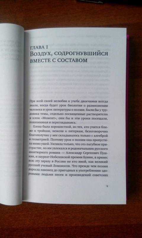 "Где бы ни родилась Лена, не подсесть на стишки ей стоило бы огромного труда. Из романов она почерпнула только, какие бывают виды прихода, а именно: скалам - восходящий и нисходящий, в зависимости от возникшего восторга; будда, превращающий голову в спокойного наблюдателя; ривер, делающий так, что мир втекает в тебя, как воздух; и тауматроп, совмещающий речь и ее изнанку в одну притягательную картину".