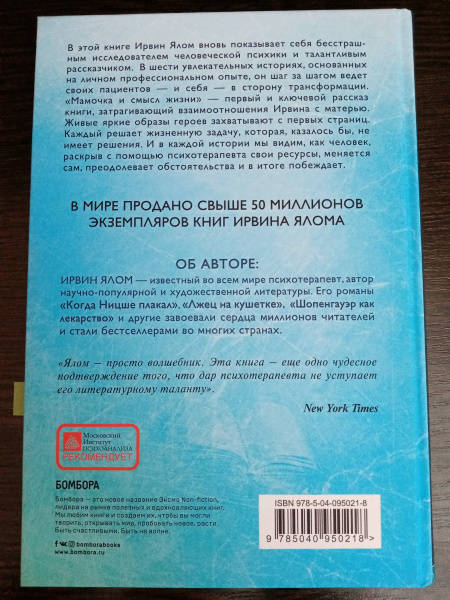 Книга заслуживает внимания однозначно! Если любите Ялома - читать! Он очень много оставляет на «подумать». Книготерапия. Минус в том, что ожидаешь больше на тему влияния родителей на жизнь детей, а снова обращаешься к смерти, горю, как его видят люди, как переживают.
