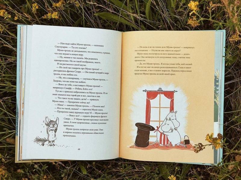 "Приключения муми-троллей предваряет текст племянницы Туве Янссон, Софии. В нем рассказывается об историях из этой книги, которые адаптированы для самых маленьких читателей. «Хорошо было лежать, свернувшись калачиком у кого-нибудь на коленях, рассматривать иллюстрации, слушать истории...