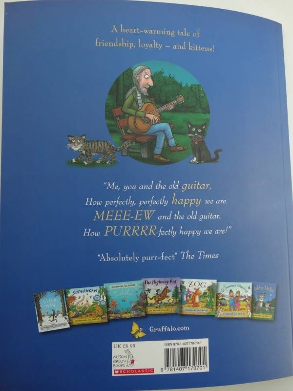 Замечательная книга от знаменитых создателей Джулии Дональдсон и Акселя Шефлера. Книга большого формата, бумага мелованная, 32 страницы, обложка из тонкого ламинированного картона с тиснением. В этой книге вас ждёт очаровательная история про двух бродячих певцов - человека и кота. История о дружбе этих двух очень понр...