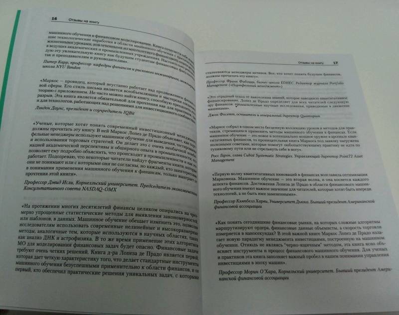 Воспользуйтесь шансом поучаствовать в «машинной революции», для этого достаточно познакомиться с первой книгой, в которой приведен полный и систематический анализ методов машинного обучения применительно к финансам: начиная со структур финансовых данных, маркировки финансового ряда, взвешиванию выборки, дифференцированию временного ряда... и заканчивая целой частью, посвященной правильному бэктестированию инвестиционных стратегий.