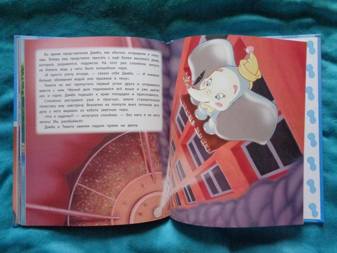 Книга очень интересная и красочная. Ребенок увидел сказку про Дамбо сначала мультфильм, ему очень понравился. Но когда он открыл книгу и увидел что там иллюстрации как в мультфильме, его удивлению не было предела. Теперь мы каждый вечер читаем эту книгу перед сном. Буквы крупные и сын сам легко читает. Большое спасибо...