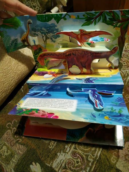 Очень яркое и красочное издание. Всего пять страниц, все картинки объемные, есть раскрывающиеся части, двигающихся деталей нет. Малышке пол года, ей нравиться рассматривать, но под присмотром взрослых. Книга очень эффектная для деток постарше.