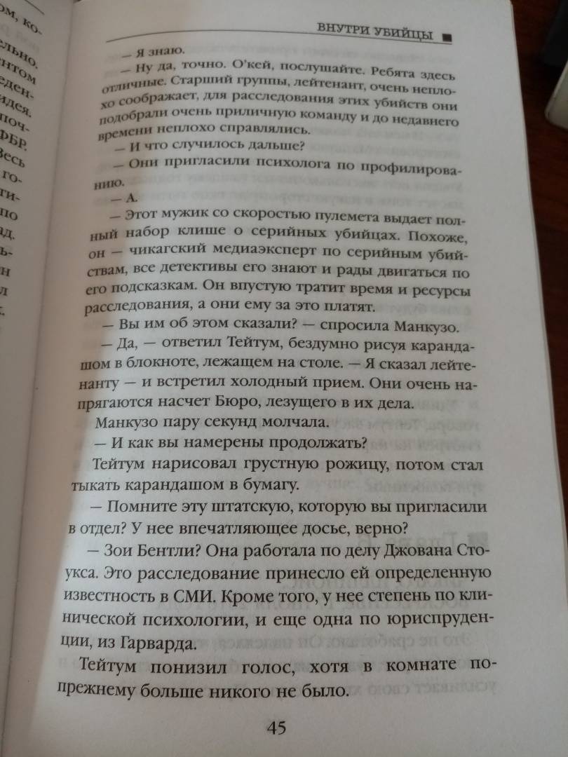 Содержание очуменное. Идёт повествование в настоящем времени и в прошлом - детстве ГГ. В оба времени идет поимка серийных убийц. Рассказываются тонкости из работы профайлера.