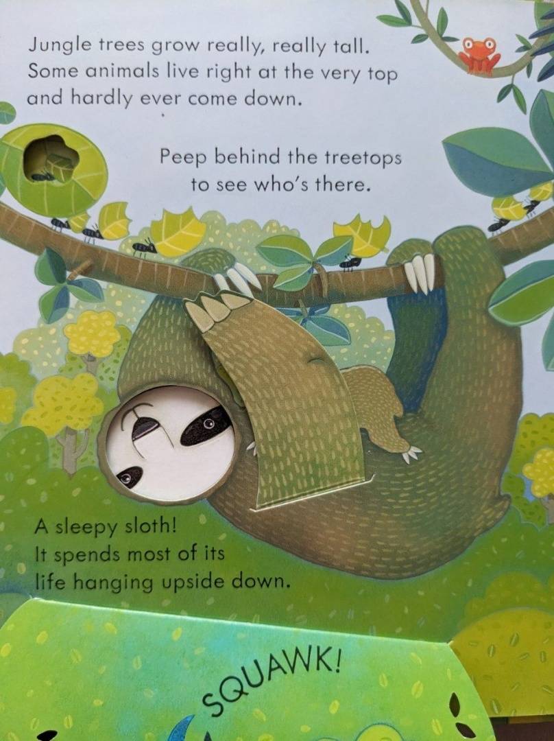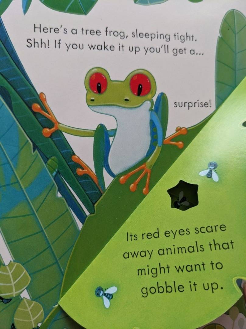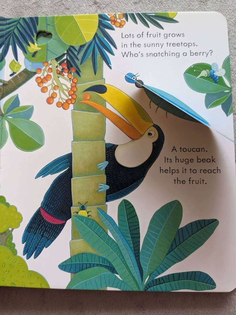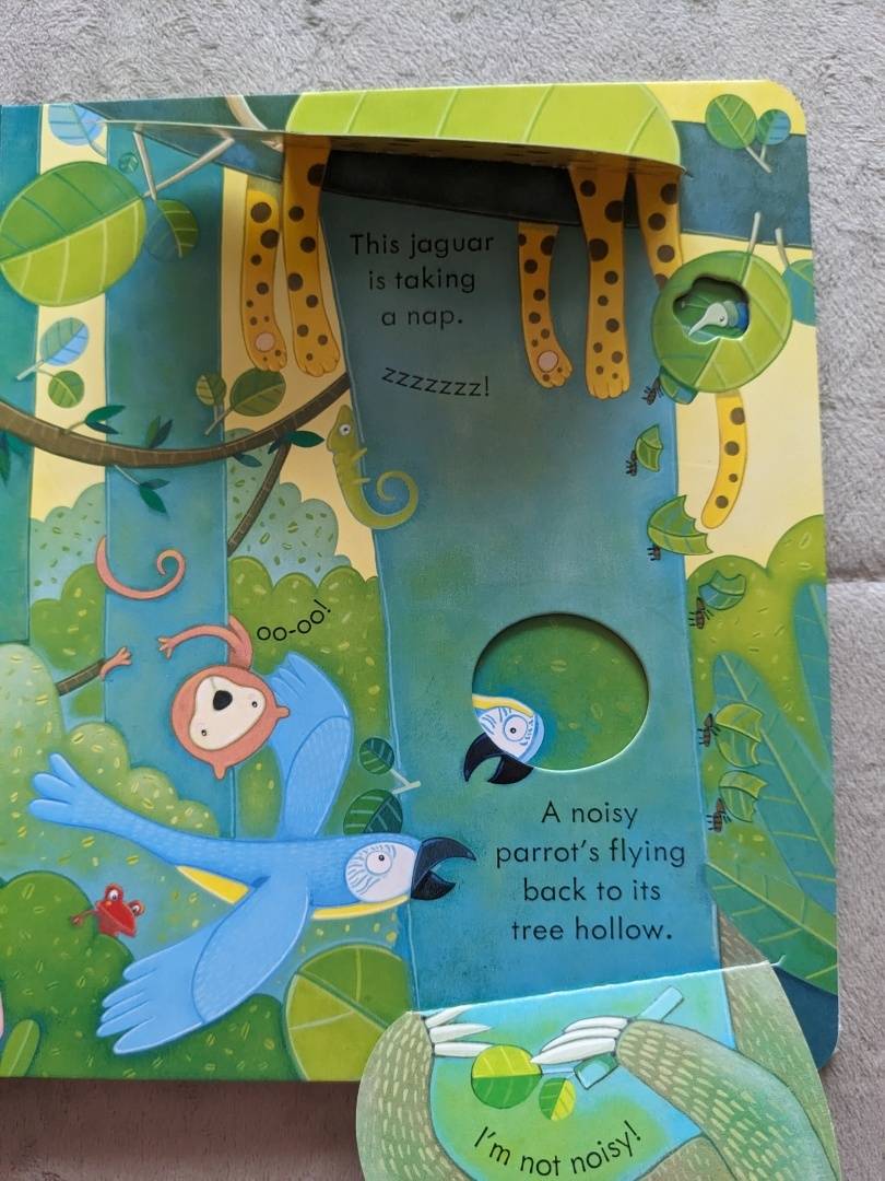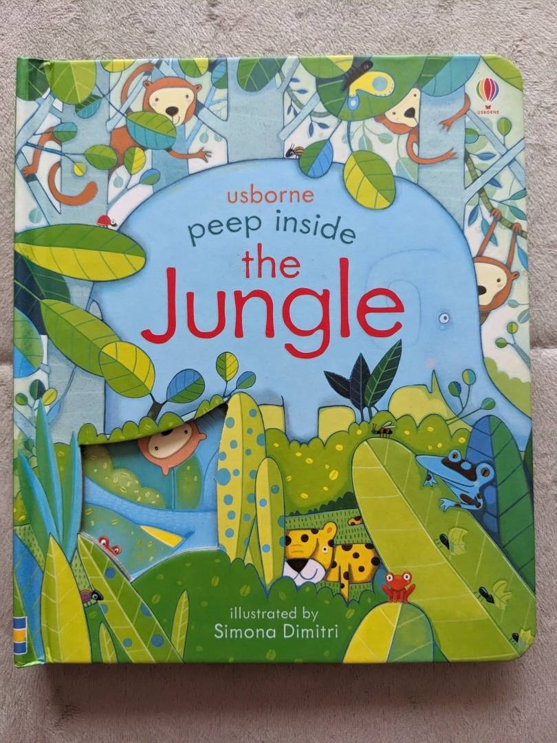 Серия peep inside всегда несомненно радует! Красивое и качественное исполнение ! 14картонных страниц с флэпами на каждой! Тема джунглей всегда интересна деткам! Тигры,необычные лианы и лягушки ,как же здорово изучать все это и запоминать новые английские слова!!!