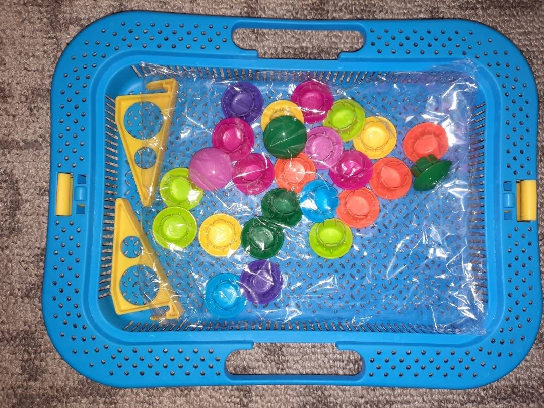 В наборе: 8 цветных картинок, 48 разноцветных кнопок, платформа с держателями для трафаретов.