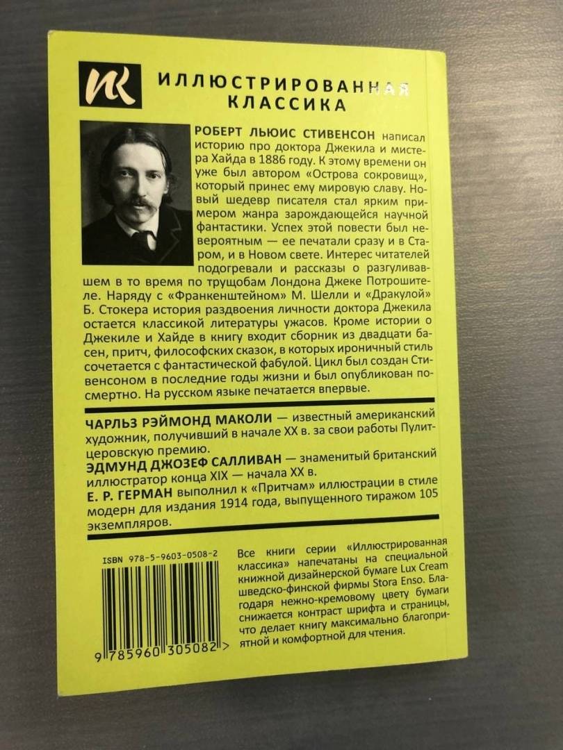 История про доктора Джекила и мистера Хайда была написана Стивенсоном в 1886 г.; она стала ярким примером жанра зарождающейся научной фантастики. Наряду с "Франкенштейном" М. Шелли и "Дракулой" Б. Стокера это произведение остается классикой литературы ужасов. Историю раздвоения личности ученого-исследователя иллюстрируют рисунки Чарльза Маколи и Эдмунда Салливана. В конце издания приводятся двадцать философских сказок-притч Стивенсона, впервые публикующихся в переводе на русский язык с иллюстрациями Е. Р. Германа, выполненными в стиле модерн для издания 1914 года, выпущенного тиражом 105 экземпляров.