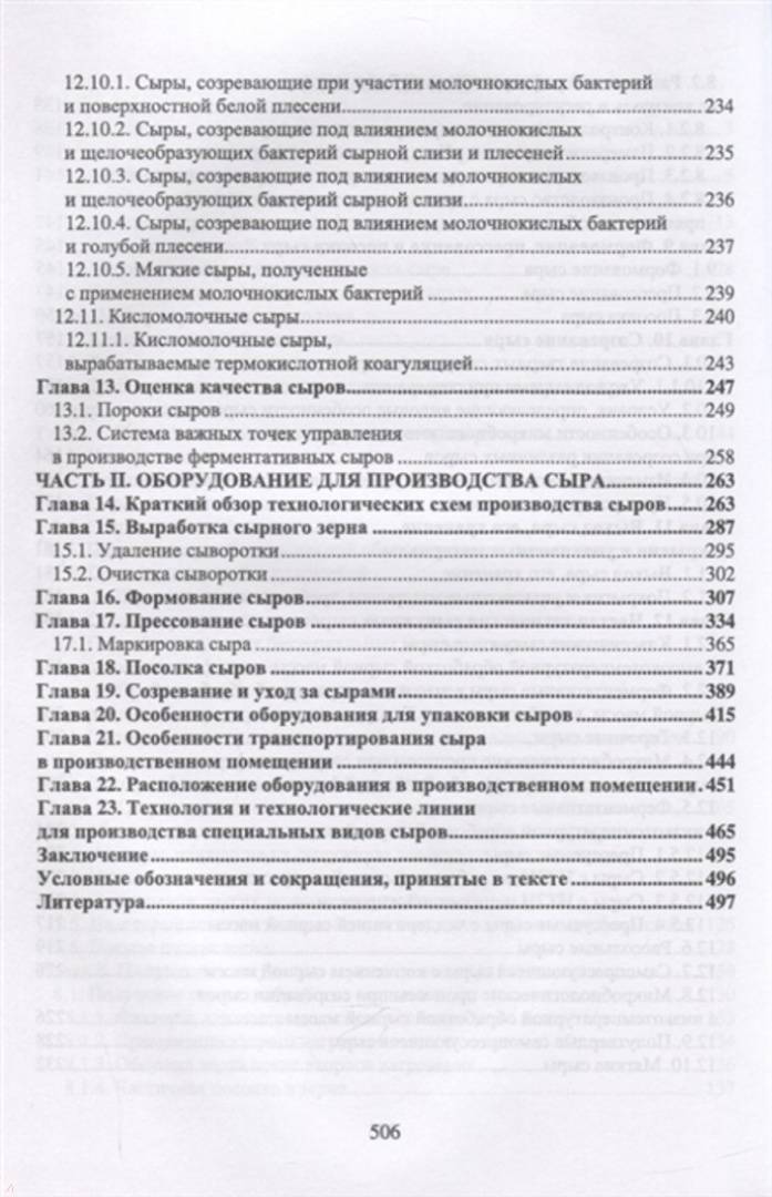 В первой главе описана история сыроделия и краткая характеристика состояния отрасли, во второй главе даны классификации сыров. Третья глава посвящена важнейшим для получения качественного сыра вопросам сыропригодности молока. В главах 4-12 пошагово рассмотрена технология получения сыров - от стадии подготовки молока до упаковывания и хранения готовой продукции. Описана специфика ряда частных технологий натуральных сычужных сыров. Глава 13 посвящена особенностям оценки качества сыров. В главах 14-23 рассмотрена техническая сторона сыроделия - современное оборудование для осуществления технологических процессов от выработки сырного зерна до подготовки сыров к реализации.