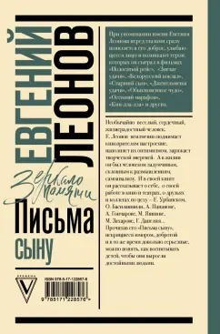 Необычайно веселый, сердечный, жизнерадостный человек, Е. Леонов неизменно поднимает кинозрителям настроение, наполняет их оптимизмом, заряжает творческой энергией. А в жизни он был человеком задумчивым, склонным к размышлениям, самоанализу. И в своей книге он рассказывает о себе, о своей работе в кино и театрах, о друзьях и коллегах по цеху - Е. Урбанском, О. Басилашвили, А. Папанове, А. Гончарове, М. Яншине, М. Захарове, Г. Данелия… Прочитав его "Письма сыну", искрящиеся юмором, добротой и в то же время довольно серьезные, можно понять, как воспитывать детей, чтобы они выросли достойными людьми.