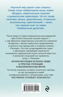 После ухода из отдела медицинских расследований врач Агния Смольская скучала недолго - к ней обратился представитель российского отделения Интерпола с весьма необычным предложением: устроиться под прикрытием в плавучую клинику "Панацея". На этом суперсовременном судне в обстановке строжайшей секретности оказывались медицинские услуги сильным мира сего. А внимание спецслужб оно привлекло, когда с "Панацеи" начали бесследно исчезать люди: и простые служащие, и высококлассные врачи. Так Агния оказалась на борту гигантского лайнера, но как наслаждаться новой интересной работой и путешествием, если тебе постоянно угрожает опасность?