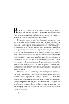 В первый раздел книги вошли общие вопросы, касающиеся веры в Бога, религии, Церкви. Во втором разделе рассмотрены темы, касающиеся Иисуса Христа и христианства. Третий раздел посвящен тому, как Церковь реагирует на вызовы современности, в том числе ее позиции по вопросам биоэтики. В четвертом разделе речь идет об особенностях православного богослужения, церковного быта, различных обрядах и обычаях, не всегда понятных, а иной раз и вызывающих недоумение. Пятый раздел посвящен злободневной теме "Церковь и политика". Наконец, в шестом разделе собраны вопросы, относящиеся к образу жизни и быту православного духовенства - Патриарха, епископов, священников и монахов.