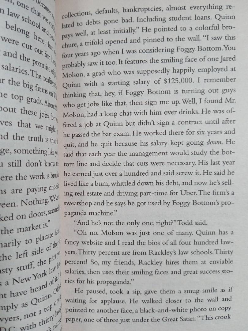 Mark, Todd, and Zola came to law school to change the world, to make it a better place. But now, as third-year students, these close friends realize they have been duped. They all borrowed heavily to attend a third-tier for-profit law school so mediocre that its graduates rarely pass the bar exam, let alone get good jobs. And when they learn that their school is one of a chain owned by a shady New York hedge-fund operator who also happens to own a bank specializing in student loans, the three know they have been caught up in The Great Law School Scam.
