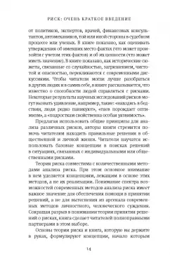 Риски повсюду. У них много источников, включая преступность, болезни, несчастные случаи, террор, изменение климата, финансы и сферу интимных отношений. Риски возникают в результате наших собственных действий или навязываются нам. В этом «Очень кратком введении» Фишхофф и Кадвани, опираясь как на естественно-научные, так и на гуманитарные соображения показывают, что объединяет все риски. Волнует ли нас потеря денег, здоровья, репутации или душевного спокойствия? Насколько мы заботимся о том, что происходит сейчас, или о том, что произойдет в будущем? Мы проявляем беспокойство о себе или о других? Прежде чем принять решение о рисках, нам требуется тщательно обдумать, что для нас важно, привлекая прошлый опыт, научные знания и учитывая неопределен-ности, связанные с будущим.