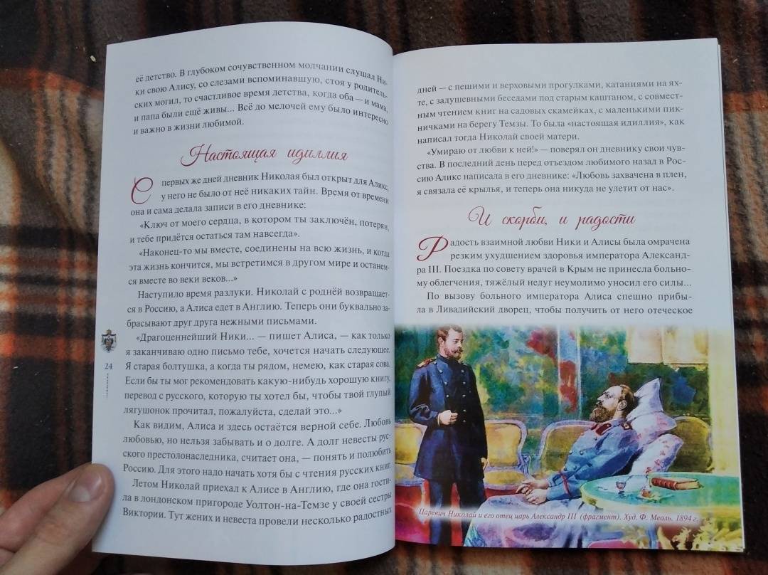 Книга о Царственных страстотерпцев, их детстве, воспитании, встречи, любви, семье. Написано очень просто, в художественном стиле. Очень много иллюстраций, это картины и фотографии, многих из которых я раньше не видела. Автор написал книгу так, что с каждой главой проникаешься в жизнь Царской семьи, проживаешь с ними, ...