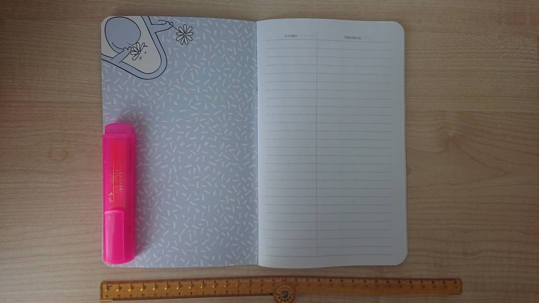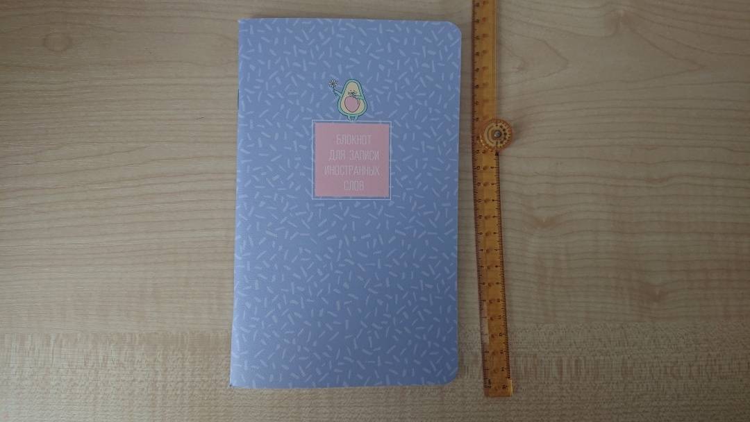 Тетрадь для записи иностранных слов с белоснежными листами в линейку, поделенными на два столбца: слово и перевод. По размеру в высоту примерно 22 см. и 26 см. в открытом виде в ширину. Обложка полностью матовая и приятная на ощупь. Переплет мягкий.