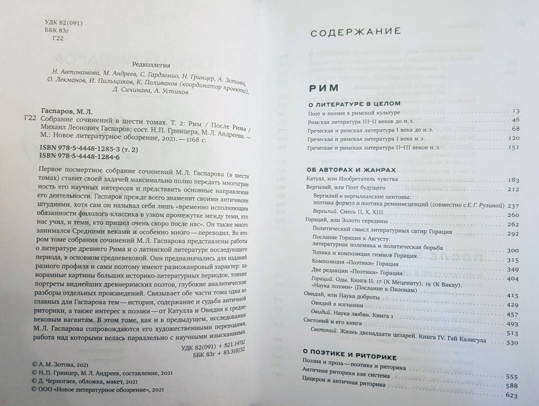 Первое посмертное собрание сочинений М.Л. Гаспарова (в шести томах) ставит своей задачей максимально полно передать многогранность его научных интересов и представить основные направления его деятельности. Гаспаров прежде всего знаменит своими античными штудиями, хотя сам он называл себя лишь "временно исполняющим обязанности филолога-классика в узком промежутке между теми, кто нас учил, и теми, кто пришел очень скоро после нас". Он также много занимался Средними веками и особенно много - переводил. Во втором томе собрания сочинений М.Л. Гаспарова представлены работы о литературе древнего Рима и о латинской литературе последующего периода, в основном средневековой. Они предназначались для изданий разного профиля и сами поэтому имеют разножанровый характер: панорамные картины больших историко-литературных периодов, тонкие портреты виднейших древнеримских поэтов, глубокие аналитические разборы отдельных произведений. Связывает обе части тома одна из главных для Гаспарова тем - история, содержание и судьба античной риторики, а также интерес к поэзии - от Катулла и Овидия к средневековым вагантам. В этом томе, как и в предыдущем, исследования М.Л. Гаспарова сопровождаются его художественными переводами, работа над которыми велась параллельно с научными изысканиями.