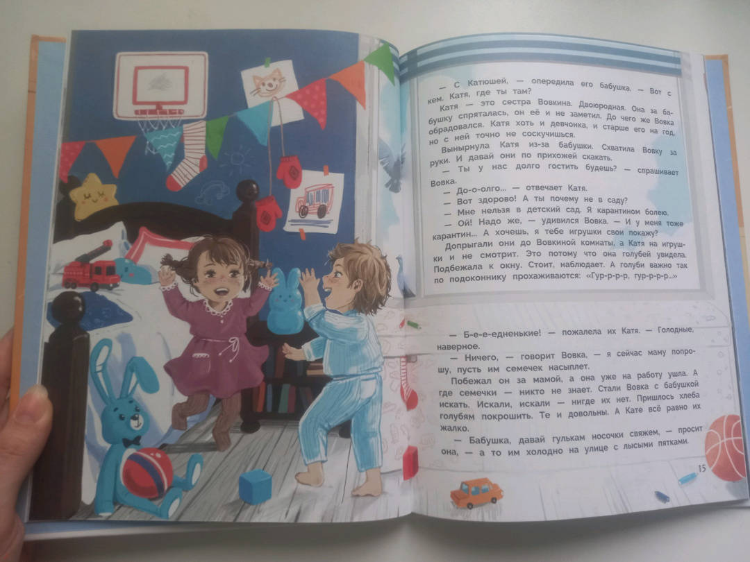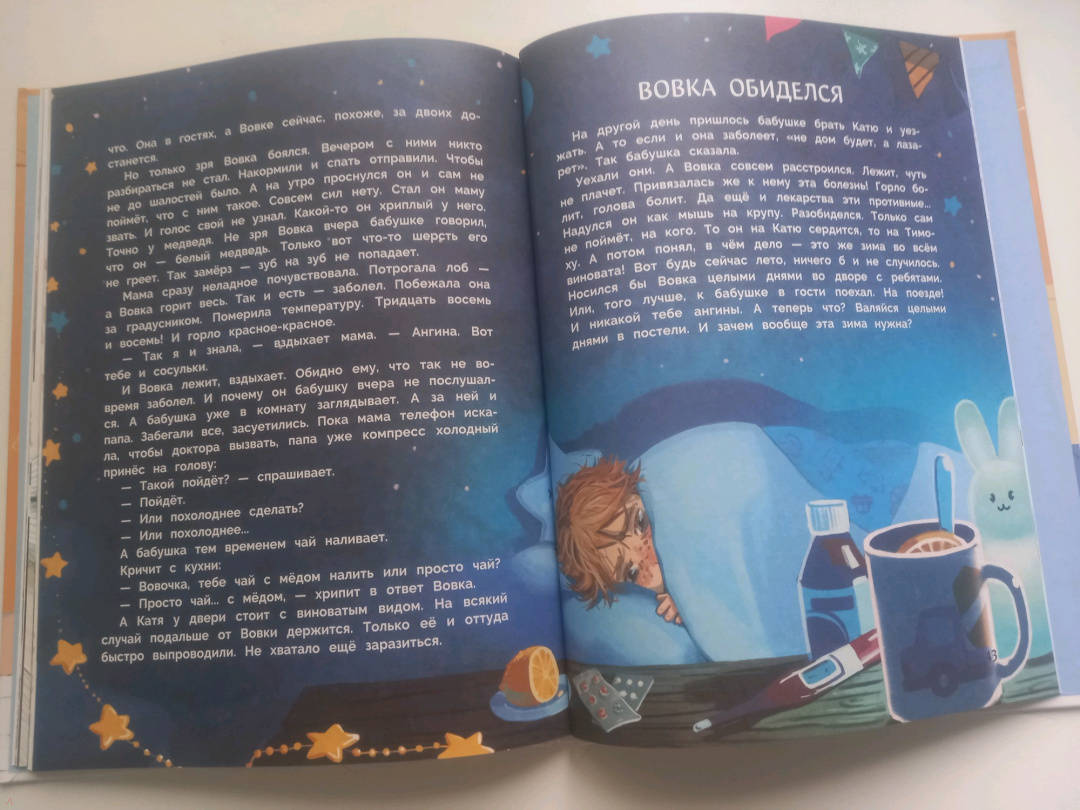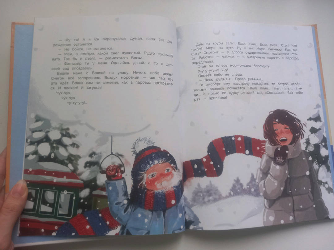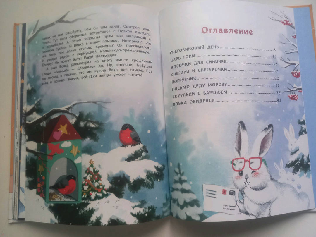 Книга нам очень понравилась. Она представляет сборник живых и близких любому дошкольников рассказов о Вове. При этом это зимние рассказы, новогодние. Тут есть бабушка, двоюродная сестра и болезнь в самое неподходящий праздничное время. Да и много всего ещё. Отличные красочные иллюстрации дополняют текст