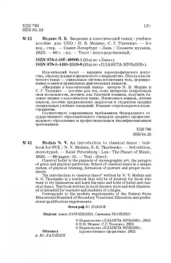 Введение в классический танец авторов Н. В. Меднис и С. Г. Ткаченко - пособие для тех, кому интересно попробовать свои возможности, изучить азы балетной техники, получить базовые знания о классическом танце. Написанное живым, легким языком, пособие предназначено педагогам и студентам средних специальных учебных заведений. Издание сопровождается иллюстрациями.