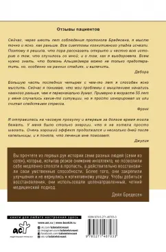 Отзывы пациентов: Сейчас, через шесть лет соблюдения протокола Бредесена, я мыслю точно и ясно, как раньше. Все симптомы когнитивного упадка исчезли. Поэтому я решила, что пора рассказать открыто и честно всю историю о том, что случилось со мной, и о том, как я выздоровела. Всем нужно знать, что болезнь Альцгеймера можно не только предотвратить, но, особенно на ранних стадиях, и вылечить. (Дебора) Пока еще некоторая информация стирается, будто «утекает» из мозга, но это происходит намного реже, и я надеюсь, что, следуя всем частям протокола, пребывая в состоянии кетоза и снижая все еще высокий уровень ртути и свинца, я справлюсь со своими проблемами. Но если лучше не станет, то я могу и дальше счастливо жить с тем, что имею, ведь я отошла от края и не скатилась к болезни Альцгеймера. (Фрэнк) Большую часть последних четырех с чем-то лет я способен ясно мыслить. Сейчас я понимаю, что мои проблемы с мышлением начались намного раньше, чем я первоначально думал. Примерно в возрасте 55 лет у меня случались какие-то ситуации, но я просто игнорировал их или считал следствием стресса. Я отправилась на часовую прогулку и впервые за долгое время могла бежать. У меня было столько энергии, что я просто не хотела идти шагом. Очень хороший эффект продолжался и несколько дней после капельницы, и я поняла, что лечение мне помогает. (Джулия) Вы прочтете из первых рук истории семи разных людей (семи из сотен), которые, испытав резкое снижение интеллекта, не позволили себе медленно сползти в пропасть, а действительно восстановили свои умственные способности. Более того, они закрепили улучшения и не вернулись к когнитивному упадку. Чтобы добиться восстановления, они использовали целенаправленный, четкий медицинский подход. Дэйл Бредесен