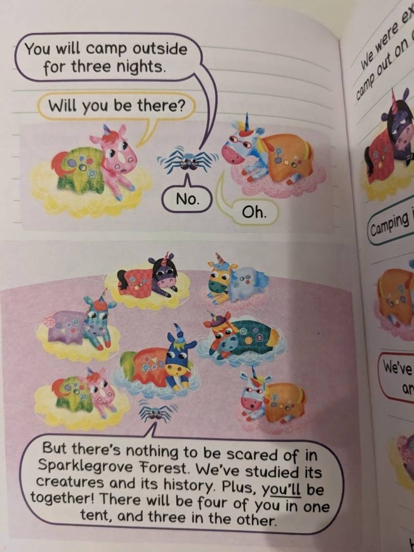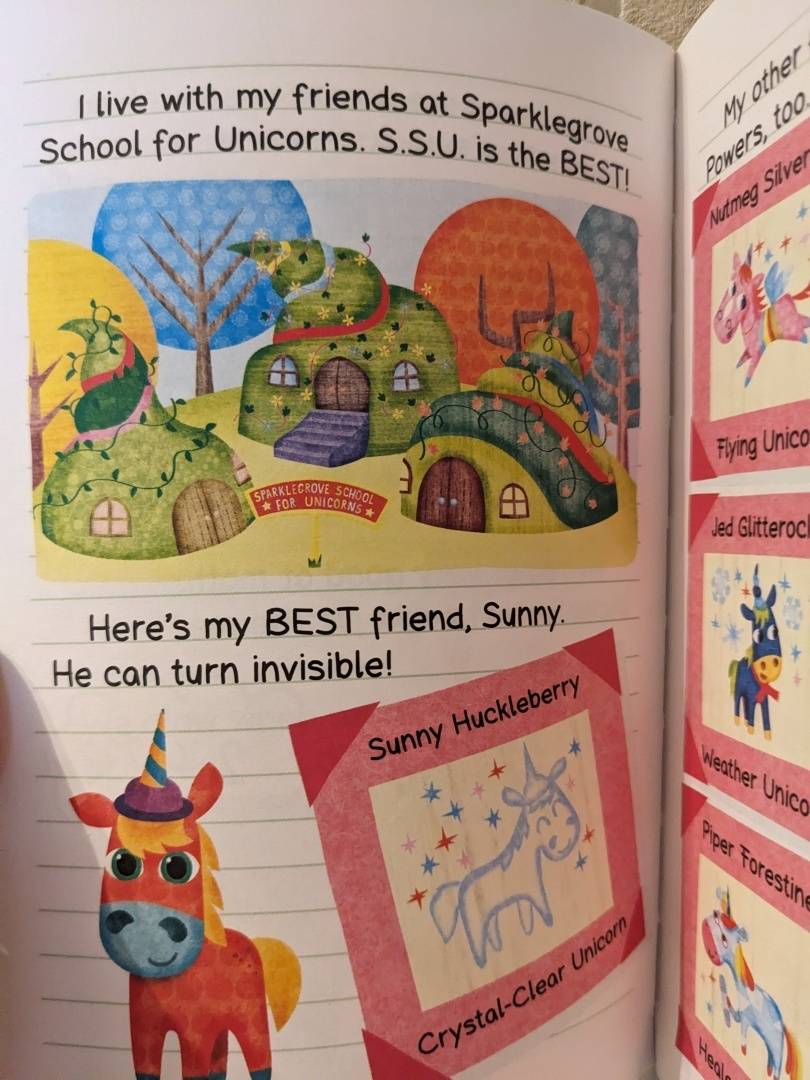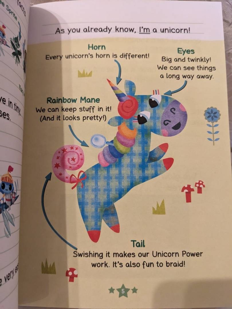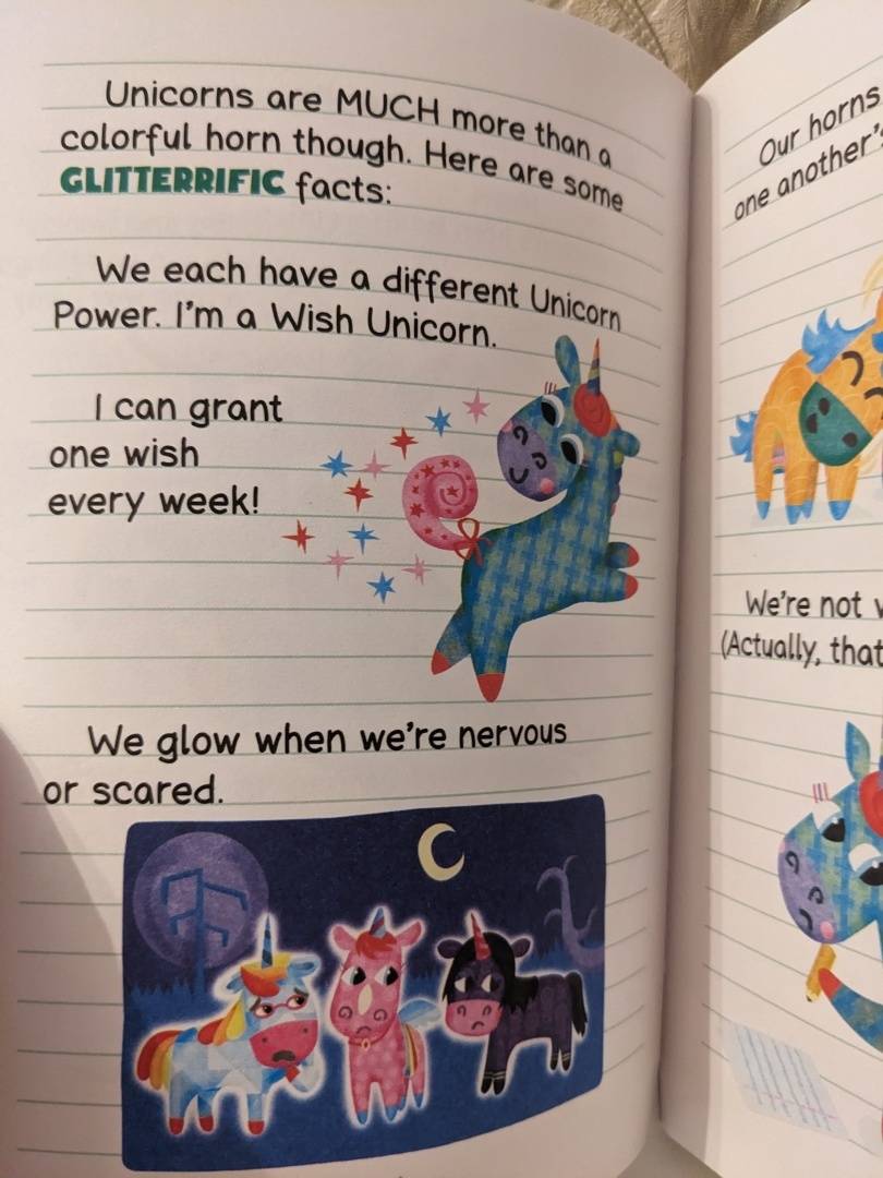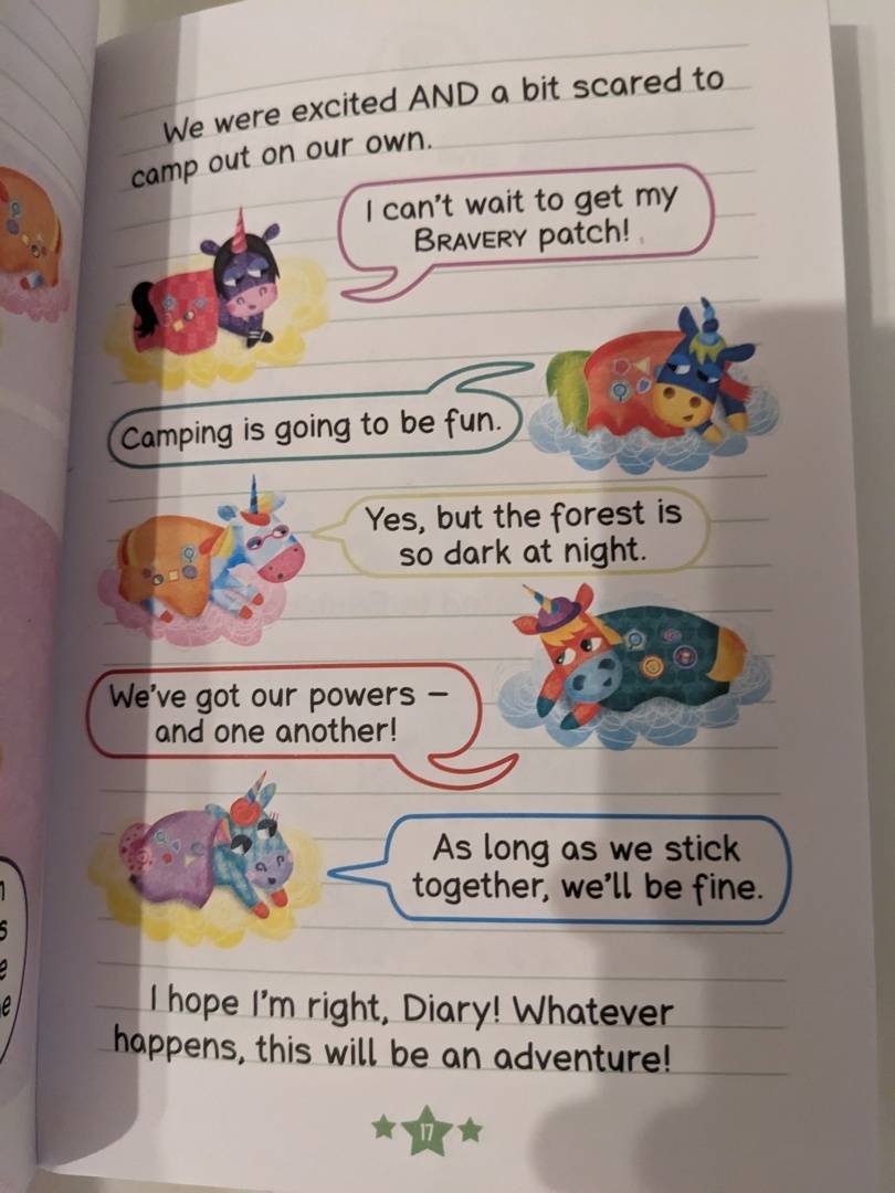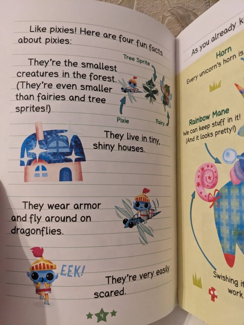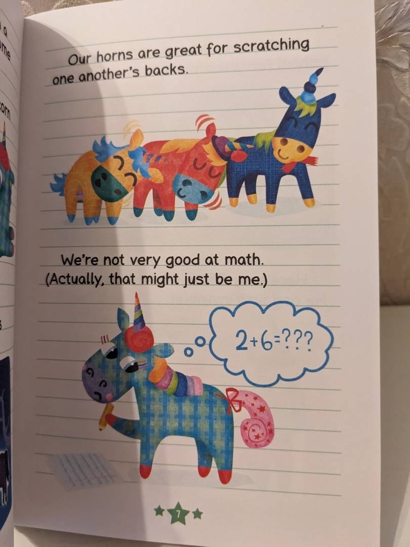 Милейшая история для любителей единорогов. Читается легко, язык простой, без сложных конструкций. Удобно брать с собой, размер книги привлекает детей. Несмотря на компактность, шрифт комфортный для чтения. Отличный вариант, когда нужно разгрузить мозг и просто насладится чем-то красочным.
