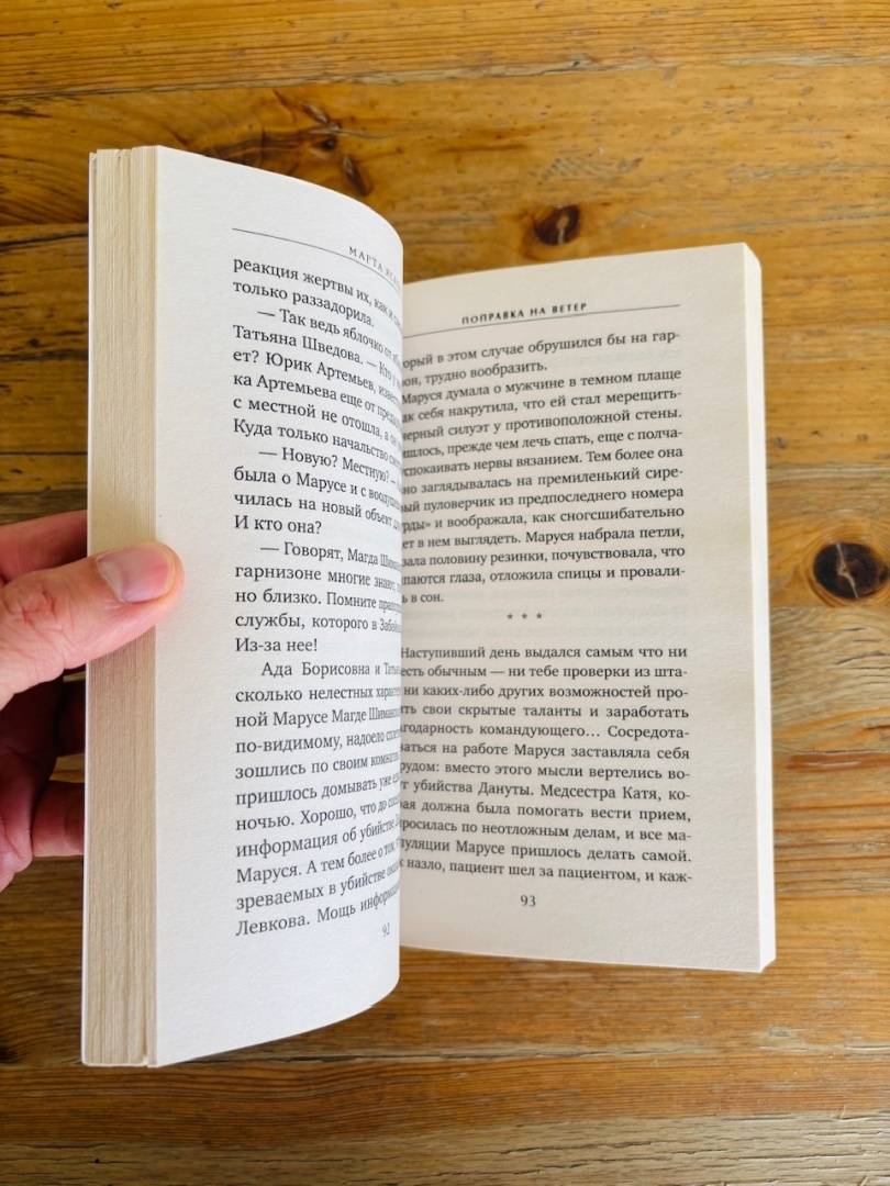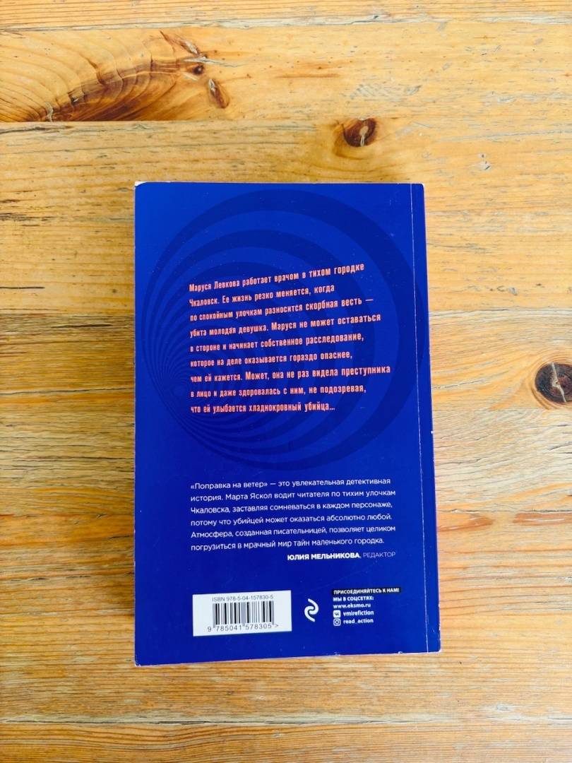 В романе «Поправка на ветер» Марта Яскол погружает читателя в маленький тихий городок Чкаловск, в котором все друг друга знают. Писательница держит интригу до последних страниц, вынуждая гадать: кто же на самом деле убийца?