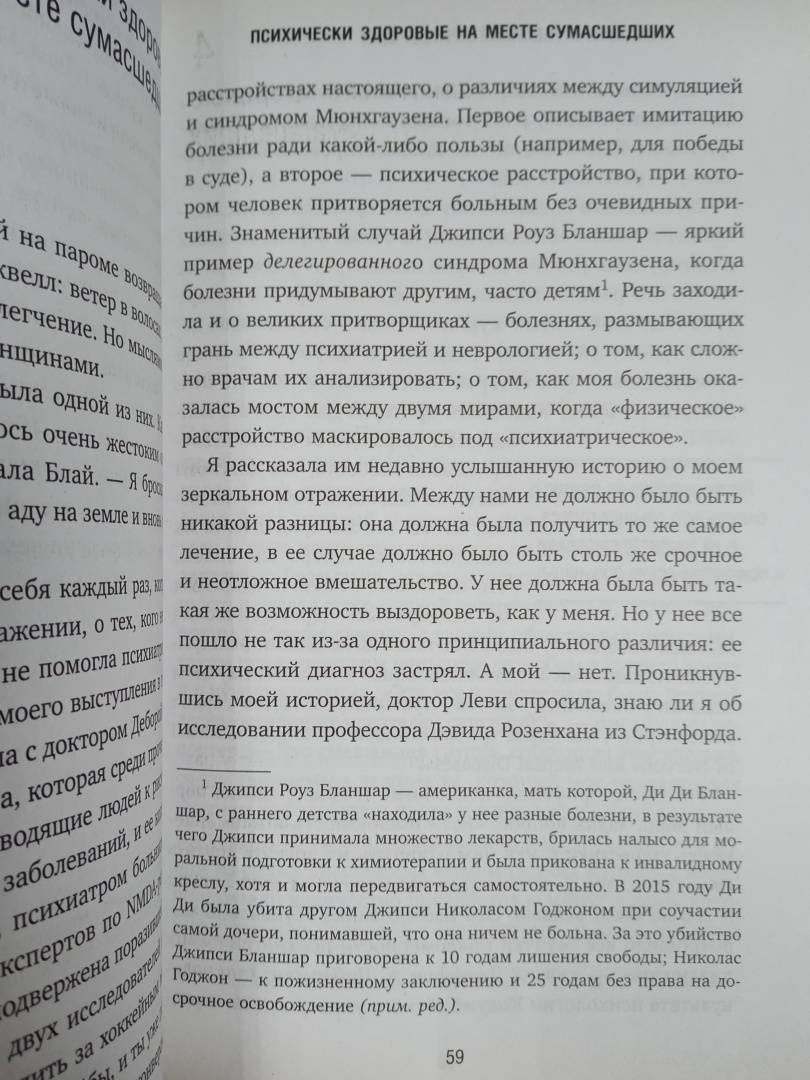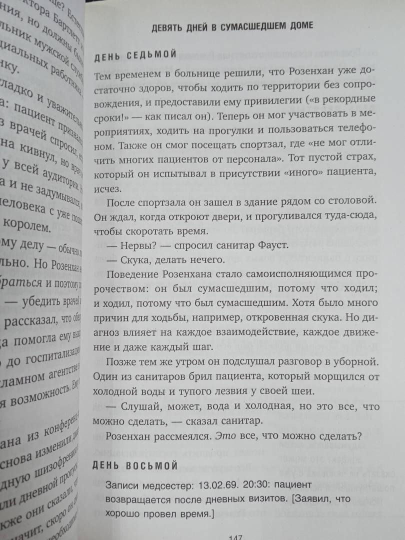 В своем расследовании она не только пытается восстановить полную картину эксперимента, проведенного Розенханом, но и ищет ответы на вопросы, которые волновали известного исследователя и волнуют тысячи людей, оказавшихся в психиатрических учреждениях, и их близких по всему миру: