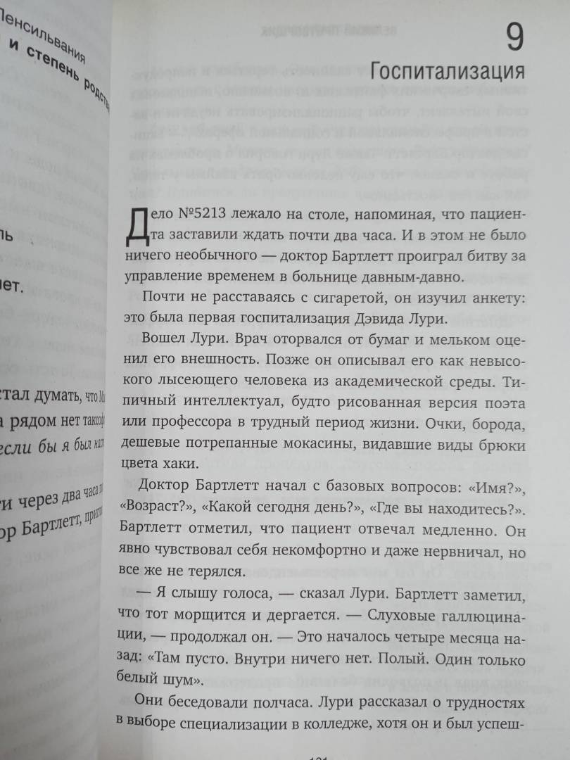"Сейчас, когда я пишу эту книгу, не существует каких-либо объективных последовательных методов постановки точного психического диагноза: депрессию не диагностируют по анализу крови, а шизофрению - по снимку мозга. Вместо этого психиатры полагаются на наблюдаемые симптомы в сочетании с анамнезом пациента и беседами с его родственниками и друзьями. Объект изучения психиатрии - это "разум", вместилище личности, идентичности и собственного "Я"".