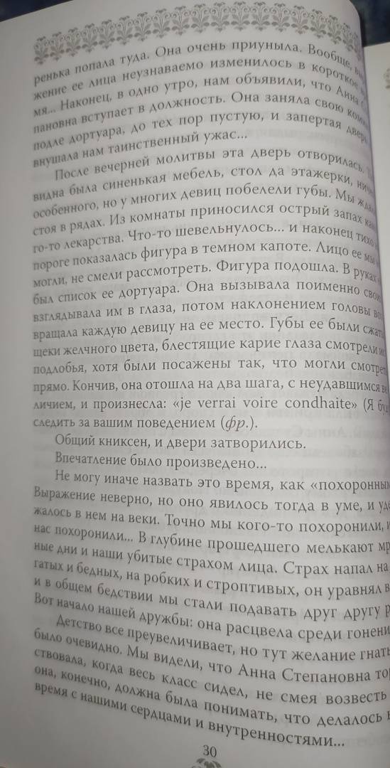 В книге представлены воспоминания женщин о жизни в Смольном институте. В книге есть фразы на французском языке. Без перевода. Также есть та лексика которая присутствовала в том времени без изменений. Интересно и быстро читаются эти истории.
