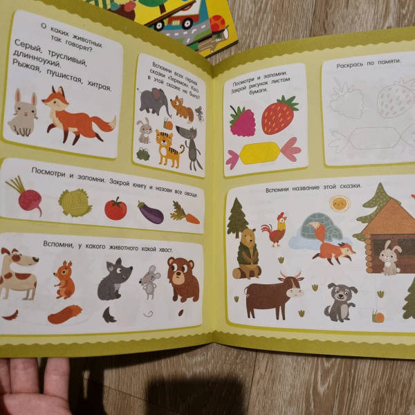 «50 заданий для развития памяти» — сборник занимательных упражнений с цветными картинками для малышей. Такие игры и упражнения развивают мыслительные способности ребёнка, тренируют мозг, формируют его представления об окружающем мире.