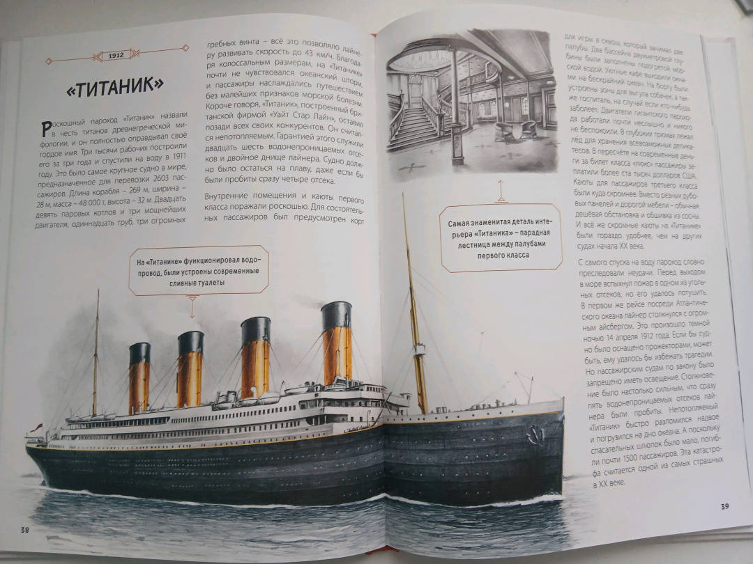 Книга сыну 6,5 лет очень понравилась, он большой поклонник транспорта. Недавно мы читали о ледоколах и айсбергах и я рассказала о Титанике, сын был сильно впечатлён, и как он удивился, что в этой книге как раз про него, просил почитать, ведь самому пока сложновато с датами и цифрами, а их тут не мало. Но общую суть ул...
