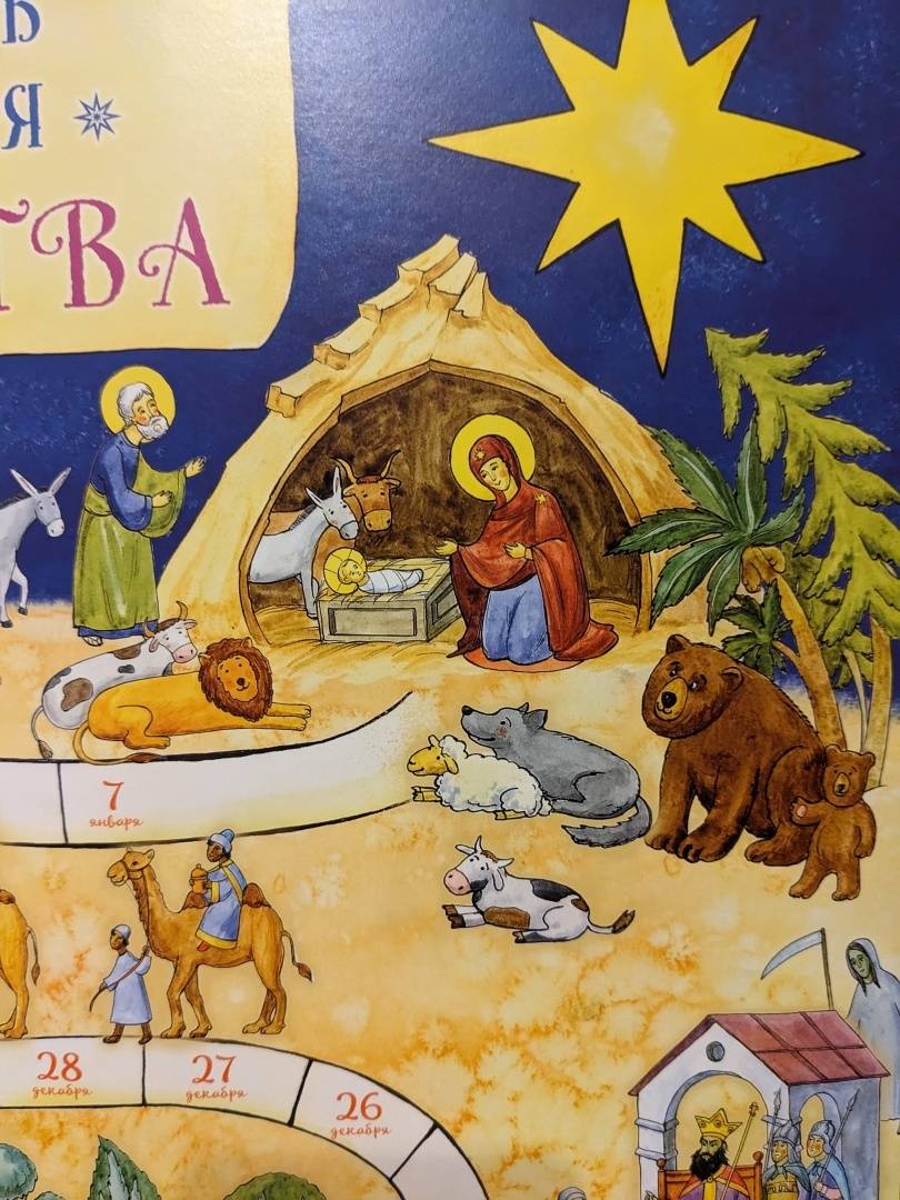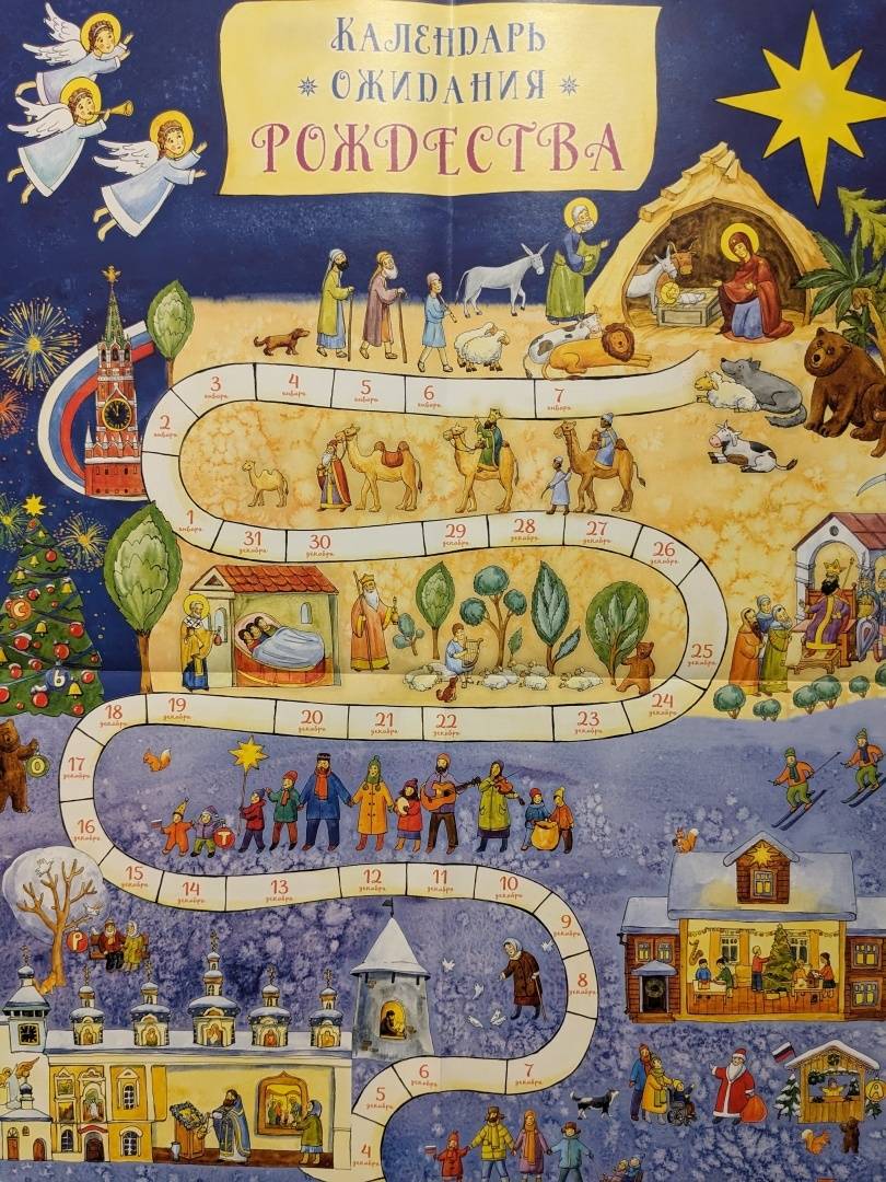 Этот интерактивным настенный календарь - наглядный путь к Рождеству Христову для всей семьи. Шаг за шагом, интересно и доступно проходим 40 дней Рождественского поста и узнаём: чем заняться с детьми, как создать дома рождественское настроение, какие праздники встречаются на пути к Рождеству, о сочельнике и богослужениях.