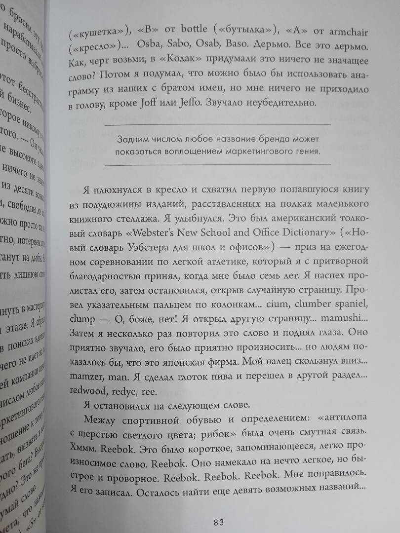 Я хочу сказать, что пошив обуви — вовсе не то, в чем я особенно силен. Ну вот, я высказался, и стало лучше. Хотя теперь тот факт, что эта книга об основателе компании Reebok, может сбить вас с толку. Надеюсь, вы также немного заинтригованы. Так и должно быть».