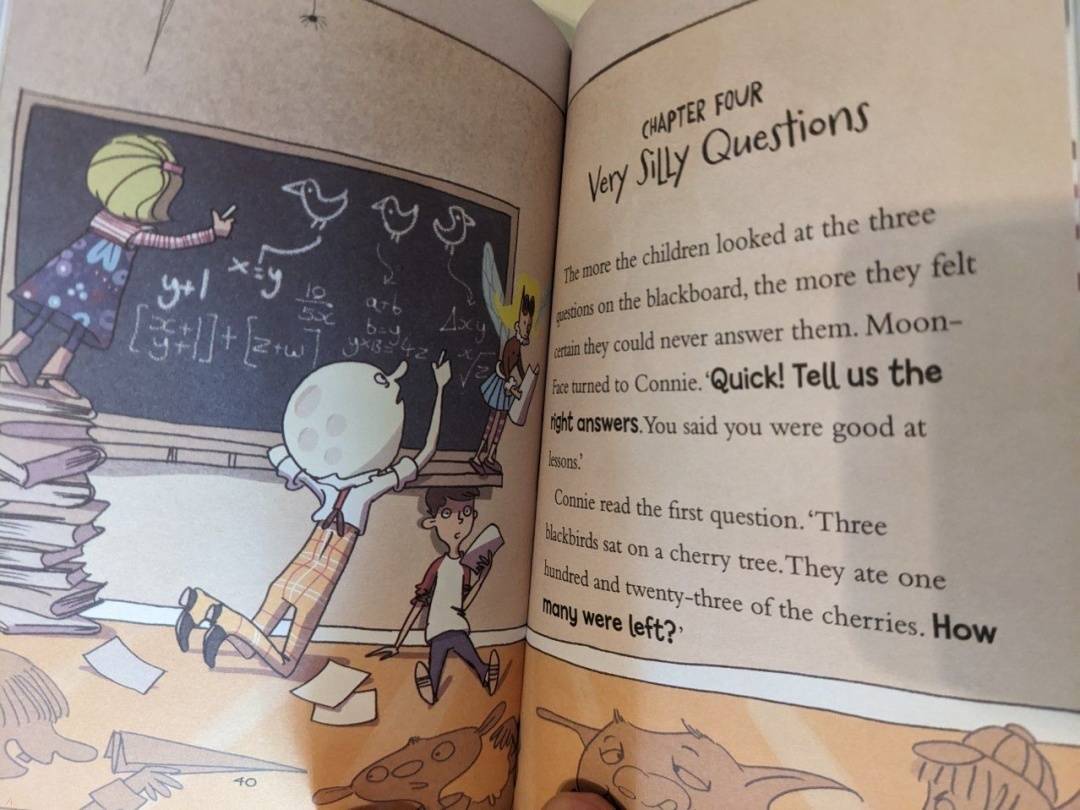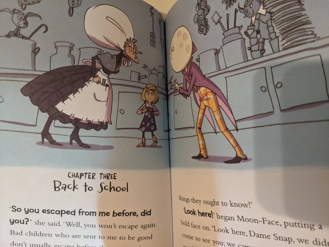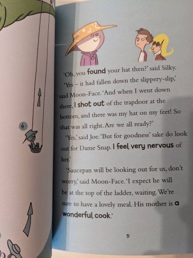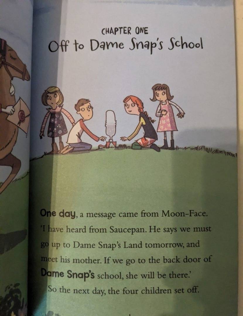 Адаптированная версия известной серии книг Энид Блайтон. Дочка, не билингв, в 6 лет с удовольствием слушает истории. В этой книге главные герои случайно попадают в школу к строгой директрисе Dame Snap. Ребята и Moon-Face решают нелепые задачки от Dame Snap и в конечном итоге спасаются бегством из этого абсурдного мес...