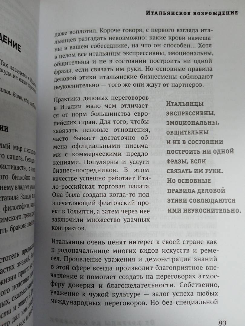 "Книга, которая может предотвратить конфликт культур, в наши дни остро необходима. Одно это уже определяет полезность труда Владислава Емельянова. С полным основанием рекомендую эту актуальную, интересную, нужную книгу, которая поможет избежать ошибок в такой важнейшей сфере деятельности, как деловые переговоры". - Светлана Тер-Минасова, заслуженный профессор МГУ, специалист по межкультурным коммуникациям
