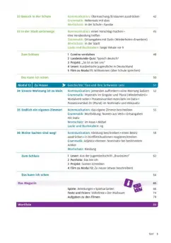 - am Ende jedes Moduls wiederkehrenden Rubriken wie z.B. Landeskunde, Projektarbeit, Sprachmittlung, Aufgaben zu den Filmen sowie eine Modul-Zusammenfassung mit Beispielen
