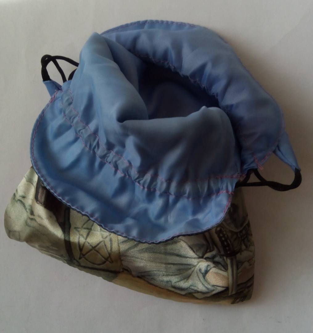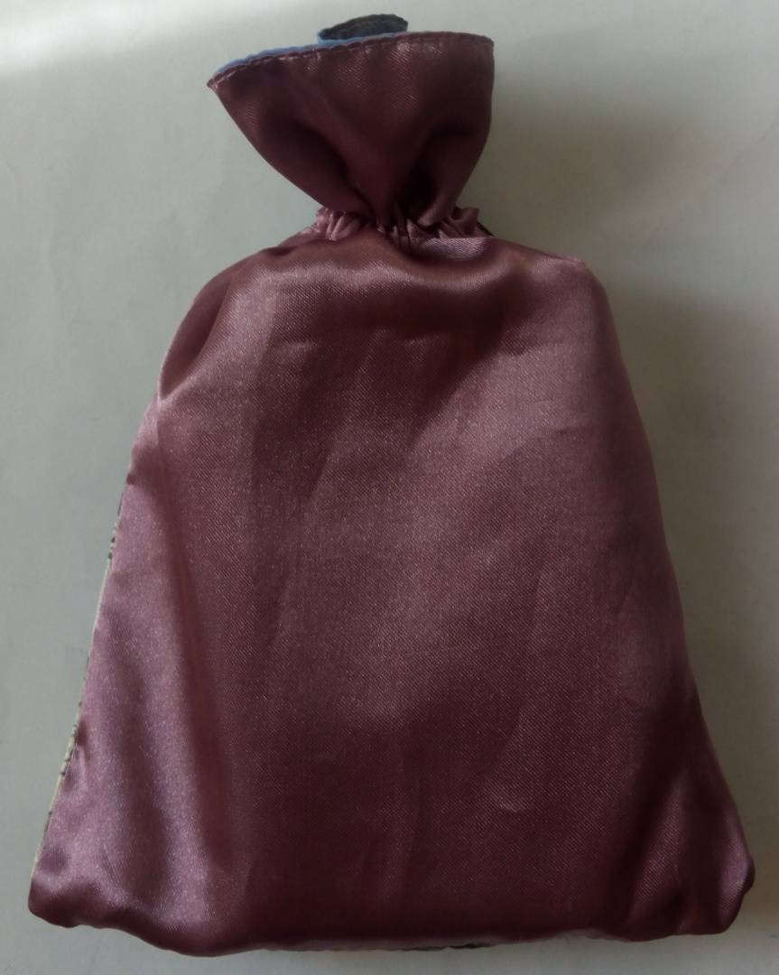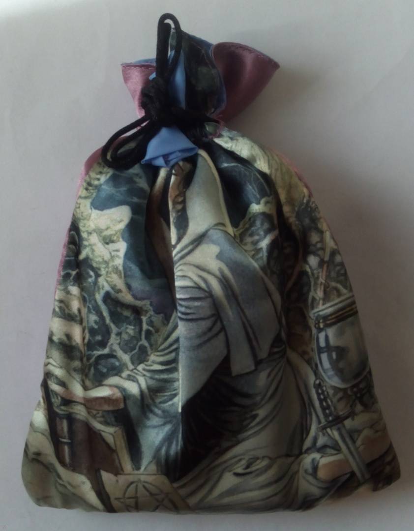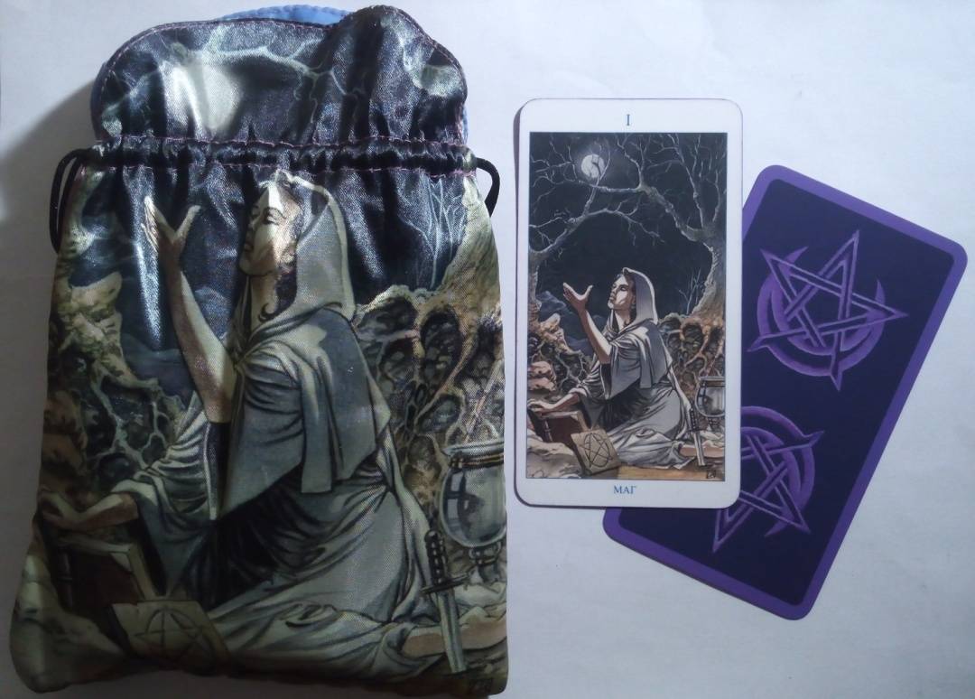 Искусственный шелк, мешочек двухслойный с подкладкой. На мешочке изображён Аркан Маг из колоды Языческое таро (она же Pagan tarot, она же Таро белой и чёрной магии).