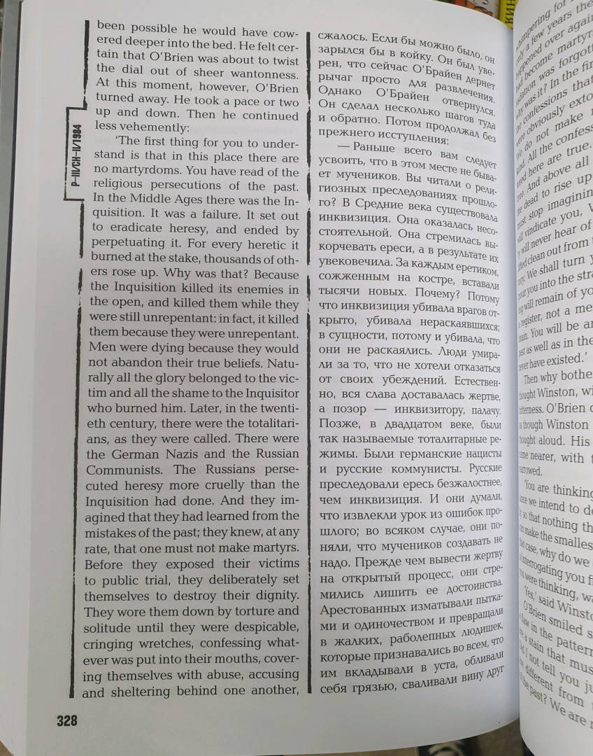 "Тысяча девятьсот восемьдесят четвертый" - культовая антиутопия английского писателя Джорджа Оруэлла, его последний законченный роман, который и по сей день волнует умы читателей по всему миру. В настоящем издании оригинальный текст романа приводится с параллельным переводом В. П. Голышева и иллюстрирован произведениями художников-экспрессионистов первой половины двадцатого века. Многие из этих художников сами стали свидетелями ужаса и страданий, рожденных двумя мировыми войнами и действиями тоталитарных режимов.