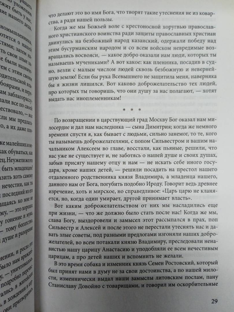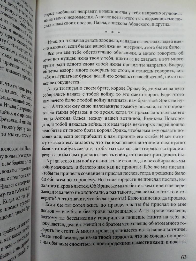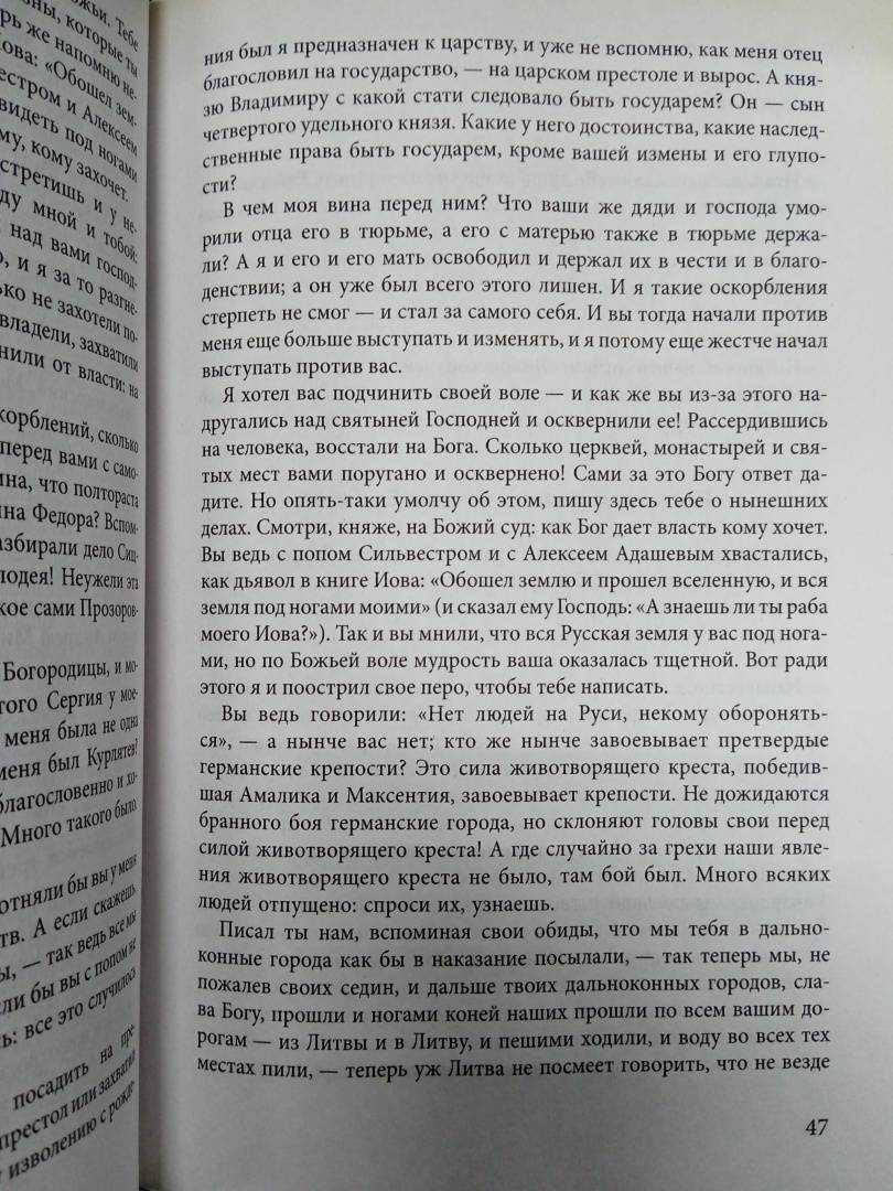 "Смелый новатор, изумительный мастер языка, то гневный, то лирически приподнятый… мастер "кусательного" стиля, всегда принципиальный, всегда "самодержец всея Руси", пренебрегающий всякими литературными условностями ради единой цели - убедить своего читателя, воздействовать на него, - таков Грозный в своих произведениях". - Д. С. Лихачев