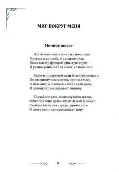 В сборнике пять разделов. Первый - "Вместо предисловия" - рассказывает, откуда у автора возникло желание писать стихи. Название второго - "Мир вокруг меня" - говорит само за себя. Раздел "От сердца к сердцу" близок, наверное, очень многим, кто любил. Всплески радости и грусти отразились в разделе "Настроение". В заключение автор решил немного пошутить, собрав в раздел "Не совсем серьёзное" свои улыбки. Порой это именно то, что надо, чтобы уйти от проблем.