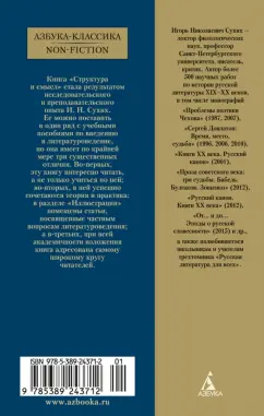 Книга «Структура и смысл» стала результатом исследовательского и преподавательского опыта И. Н. Сухих. Ее можно поставить в один ряд с учебными пособиями по введению в литературоведение, но она имеет по крайней мере три существенных отличия. Во-первых, эту книгу интересно читать, а не только учиться по ней; во-вторых, в ней успешно сочетаются теория и практика: в разделе «Иллюстрации» помещены статьи, посвященные частным вопросам литературоведения; а в-третьих, при всей академичности изложения книга адресована самому широкому кругу читателей.