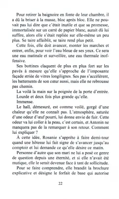 Restée mutique suite à un traumatisme dont elle n'a aucun souvenir, Rosanie vit à l'abri du monde depuis vingt ans, enfermée dans son univers feutré, protégée par son sauveur devenu son mari. Un jour, attirée par les thermes de la ville - ; elle qui craint pourtant l'eau - ; elle rencontre Félice, u