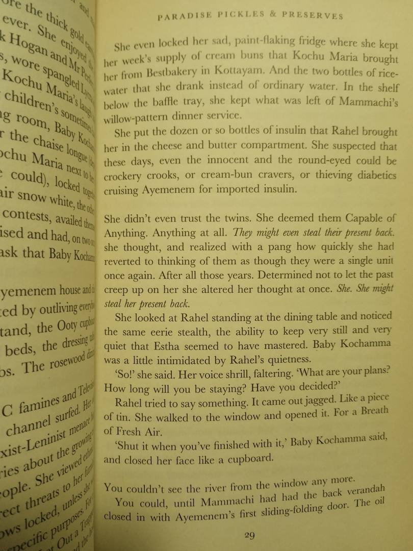 Set against a background of political turbulence in Kerala, Southern India, The God of Small Things tells the story of twins Esthappen and Rahel. Amongst the vats of banana jam and heaps of peppercorns in their grandmother’s factory, they try to craft a childhood for themselves amidst what constitutes their family – their lonely, lovely mother, their beloved Uncle Chacko (pickle baron, radical Marxist and bottom-pincher) and their avowed enemy Baby Kochamma (ex-nun and incumbent grand-aunt).
