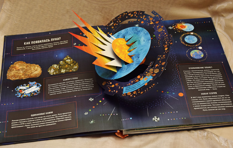 Когда моему сыну еще не было и года, я давала разовые уроки английского детям, которые учились во втором и третьем классах. Тогда я отметила, что им очень нравятся картонные томики с «окошками» и с раскрывающимися страницами с полки моего ребенка. Все они охотно делились своими впечатлениями и сказали, что у них тоже были похожие, но сейчас, «когда они выросли», остались только обычные книжки. «Луна» Анны Янкелевич – книга с объемными иллюстрациями, которая адресована как раз не малышам, а школьникам. Такое издание порадует тех, кто уже достаточной взрослый, чтобы читать и рассуждать о космосе, но при этом обращает внимание на особую подачу информации. Интерактивная составляющая книги действительно впечатляет. Сложные конструкции разворачиваются, и каждая представляет научную модель какого-то явления.