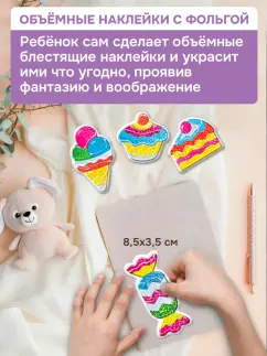 В коробке вы найдете всё для создания всевозможных аппликаций, из картона и мягкого пластика, с фольгой, наклейками и блестящими деталями, 3D-игрушек, подело